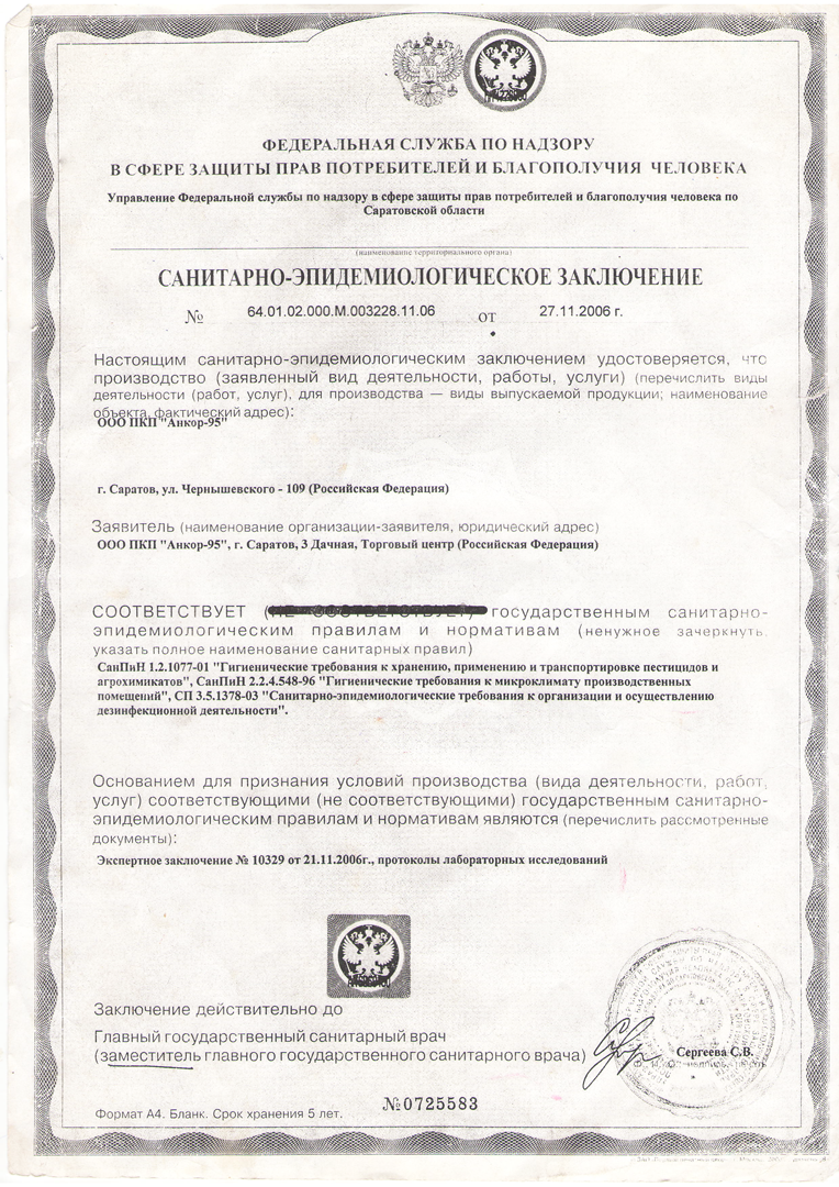 Предприятие ООО ПКП «Анкор-95» соответствует всем государственным санитарно-эпидемиологическим правилам и нормативам, предъявляемым к предприятиям данного профиля. Экспертное заключение № 10329 от 21.11.2006г.